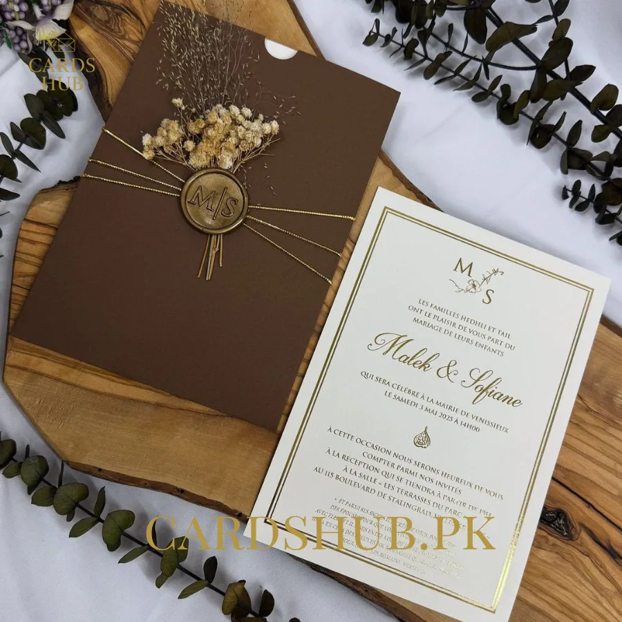 This brown luxury wedding invitation card is designed for couples who want a rich, warm, and elegant wedding look. The deep brown tone gives a strong and premium feel, while the clean layout keeps the design refined and easy to read. The contrast with the ivory inner card makes the text stand out clearly.