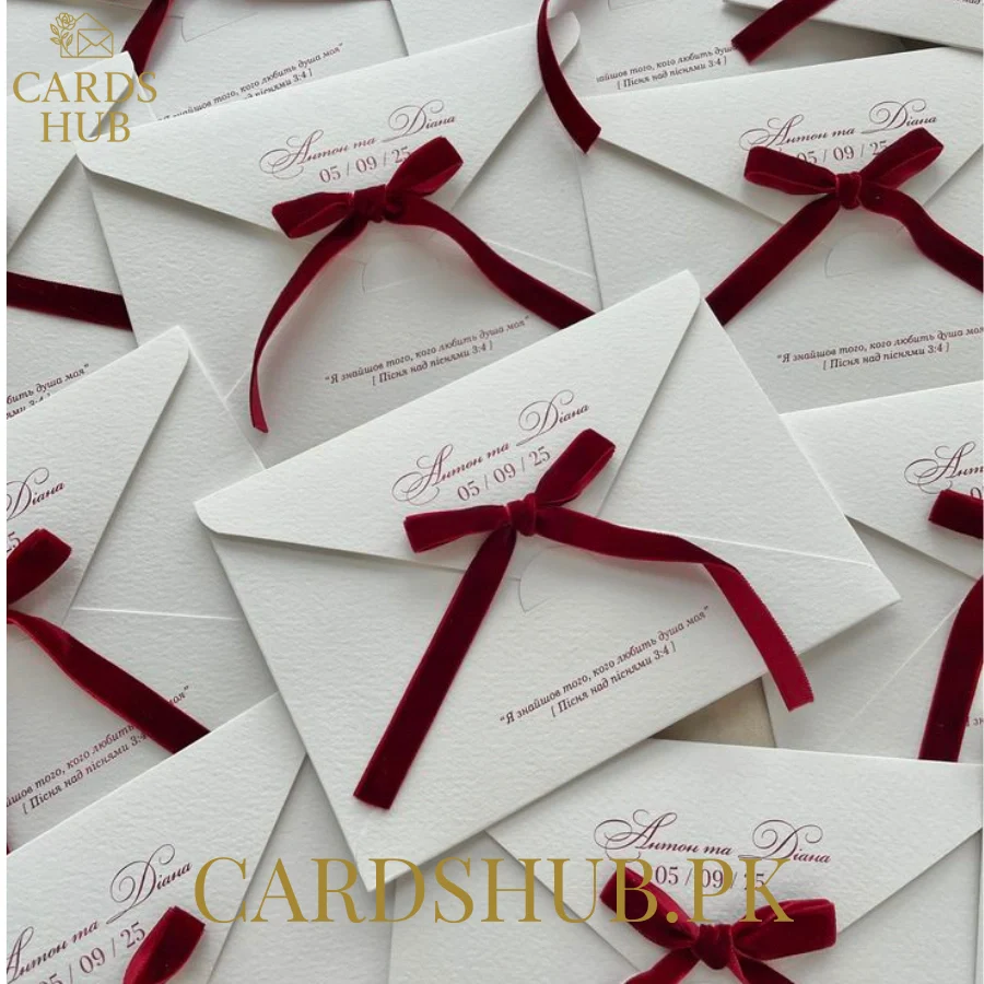 This elegant white envelope wedding invitation is perfect for couples who want a simple, classy, and romantic style. The invitation is designed in a clean envelope shape and printed on premium textured cardstock. A soft red velvet ribbon is tied into a beautiful bow, giving the card a luxury and modern touch.