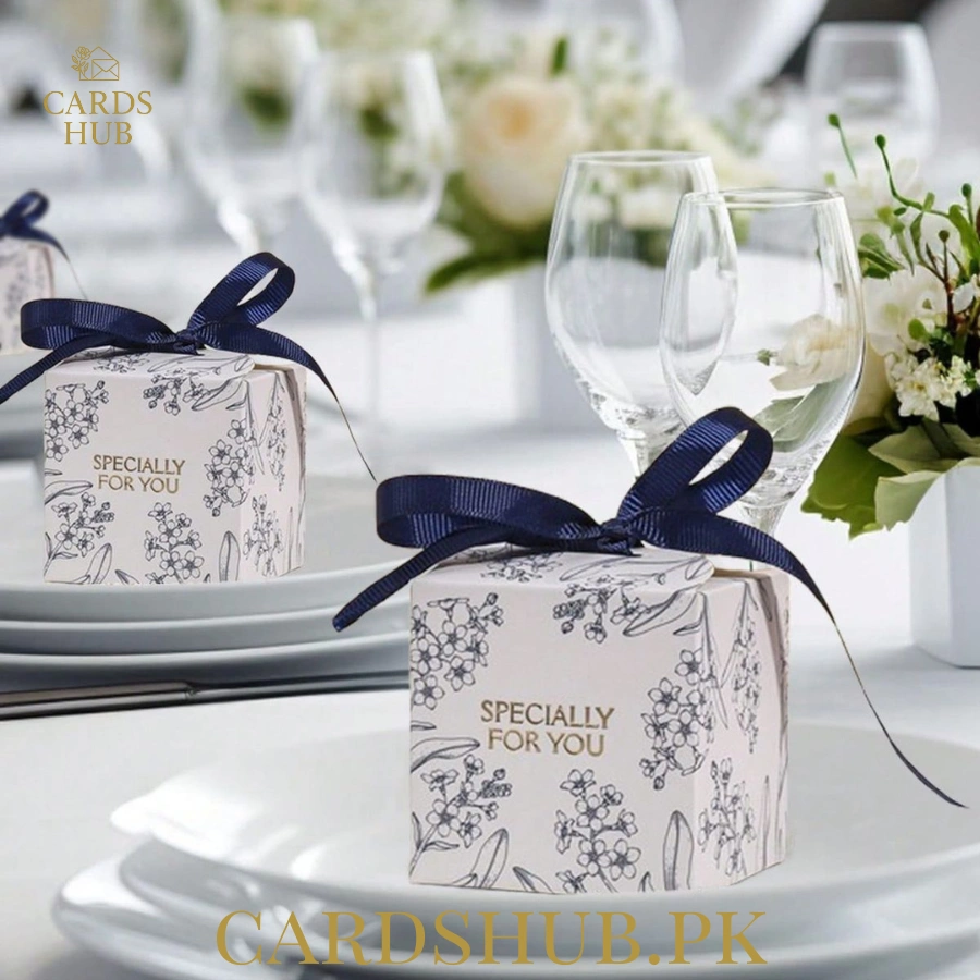 These floral wedding favor boxes with a navy ribbon are perfect for couples who want a clean, classy, and timeless look for their wedding table setup. The soft floral print paired with a deep navy ribbon creates a beautiful contrast that looks elegant on dinner tables, gift tables, and reception setups.