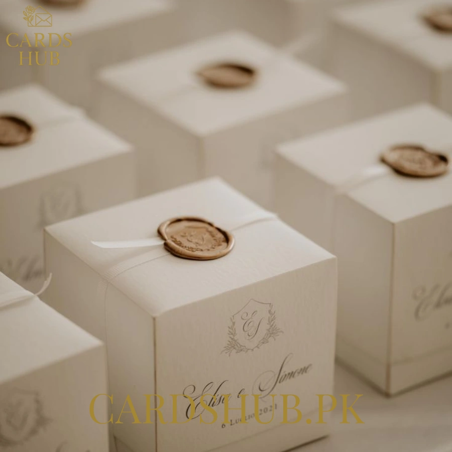 These favor boxes are perfect for wedding favors, nikah favors, walima giveaways, and engagement return gifts. The neutral ivory color matches easily with any wedding theme, whether modern, minimal, or traditional. The wax seal detail gives it a timeless and luxury feel that many people search for when choosing premium wedding favor boxes.
