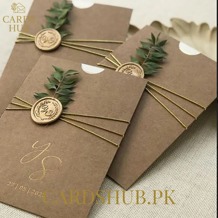 The kraft texture gives the card a handmade and premium feel, while the gold foil monogram and date add a touch of modern luxury. This style is highly searched as kraft wedding cards, rustic invitations, wax seal wedding cards, boho wedding invites, that make a good option for you