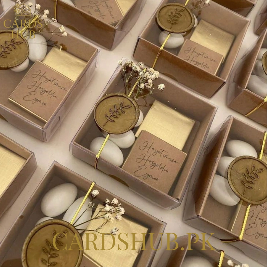 Inside the box, you can place any small favor of your choice, making it fully customizable. It is spacious enough to include items such as chocolates, sugared almonds, mini soap bars, dua cards, date sweets, dry fruits, or personalized thank-you notes. The neutral kraft theme gives it a warm, handmade look that guests always appreciate.