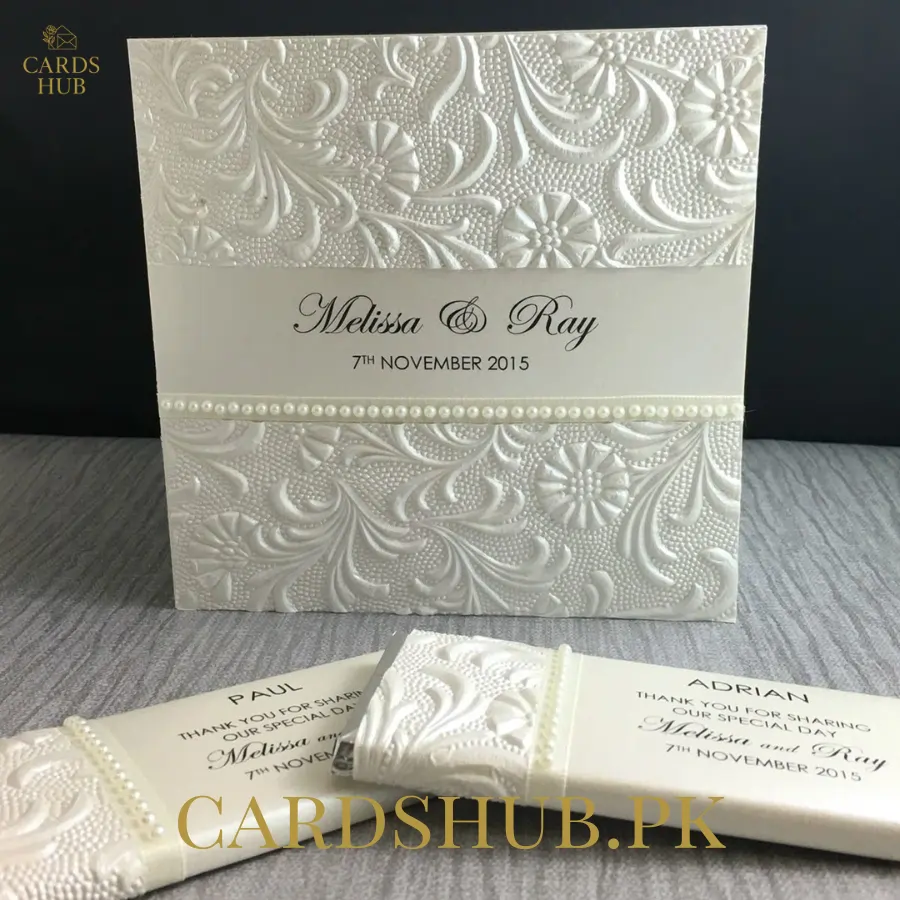 This luxury embossed wedding invitation card is designed for couples who want timeless elegance and refined detailing. The raised floral embossing paired with a soft ivory tone creates a graceful first impression, while the delicate pearl band adds a touch of classic luxury. Ideal for formal weddings, nikah ceremonies, and elegant receptions, this card reflects sophistication without being overly flashy.
