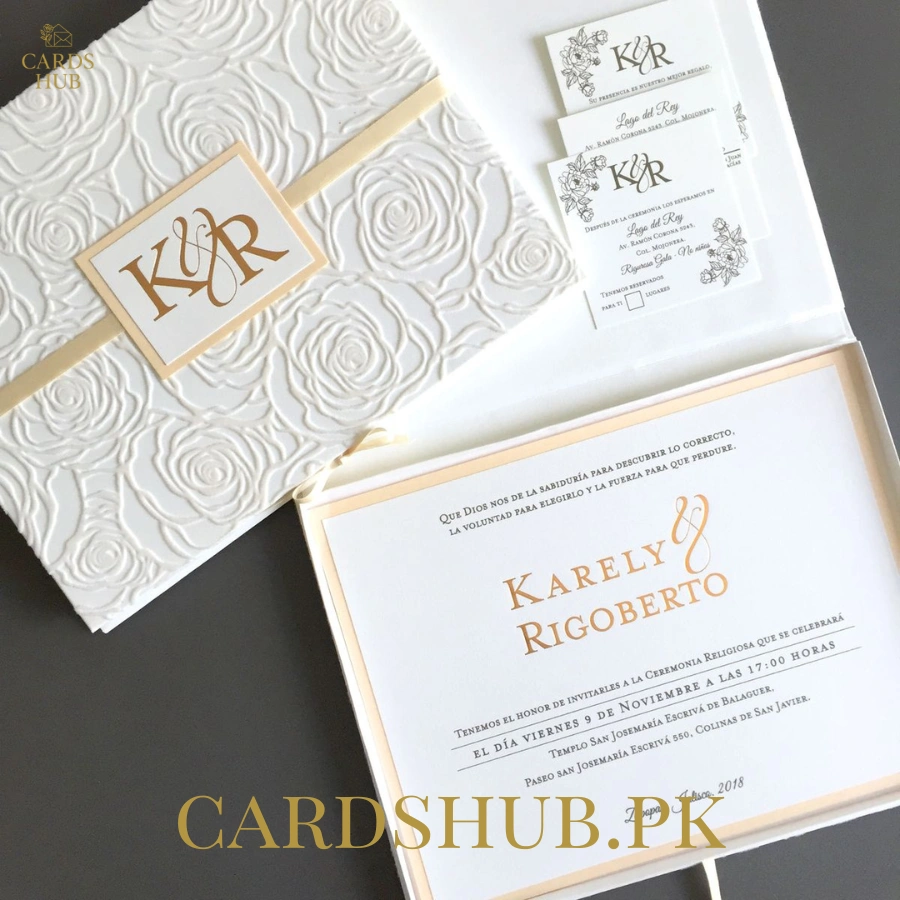 This luxury rose embossed wedding invitation is crafted for couples who want their wedding announcement to feel truly special and unforgettable. The raised rose floral pattern symbolizes love and commitment, while the soft ivory base paired with elegant gold detailing adds a royal and timeless charm. The structured box-style presentation makes this card perfect for families who want to leave a strong first impression on their guests.
