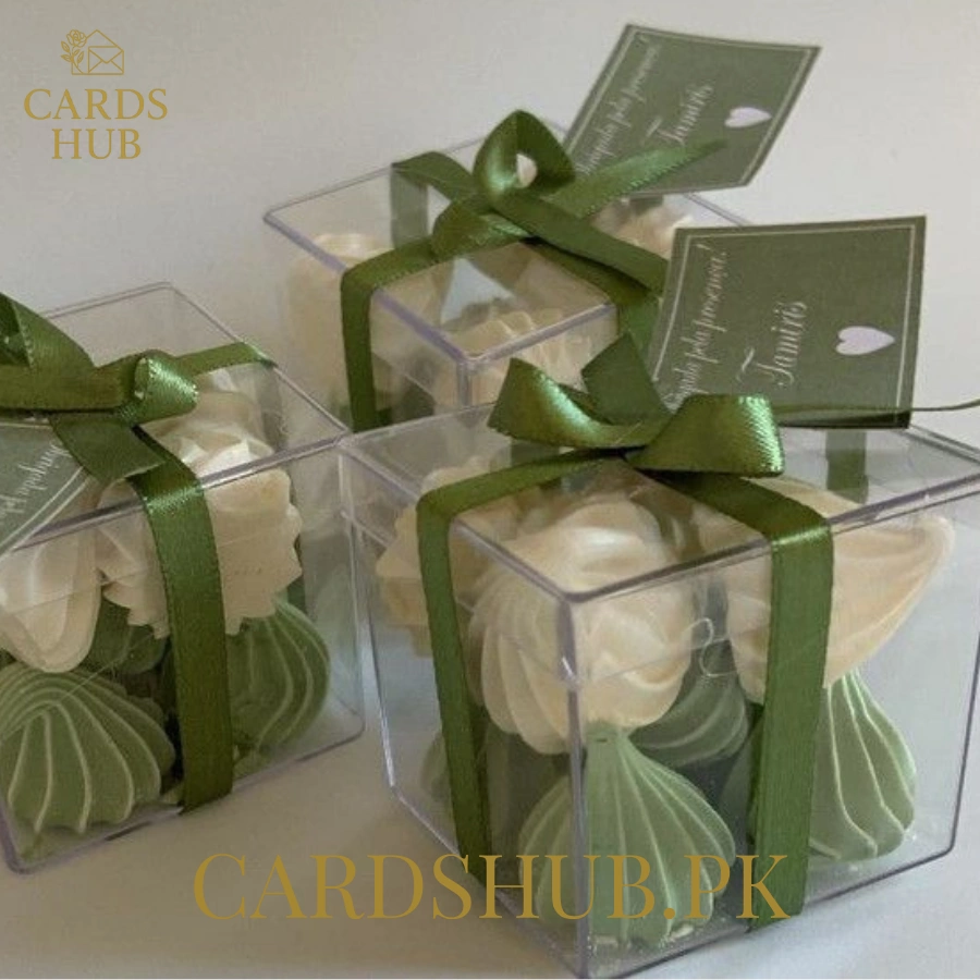These elegant mini meringue-inspired favors are packed in a premium transparent box and tied with a satin ribbon for a beautiful, luxury finish. Each box includes soft cream and sage green pieces that look aesthetic and match modern event themes.