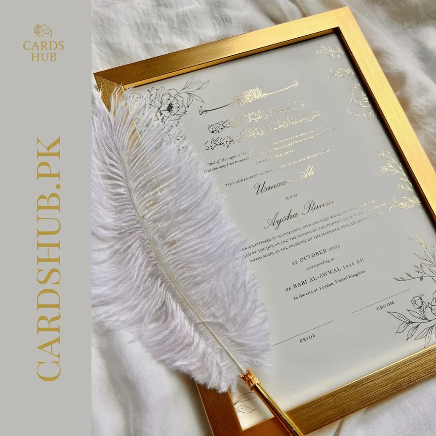 This minimal gold nikah frame is created for couples who love clean design with a touch of luxury. The soft neutral background, fine gold foil Islamic text, and delicate floral line art give this frame a calm and modern feel that never looks heavy.