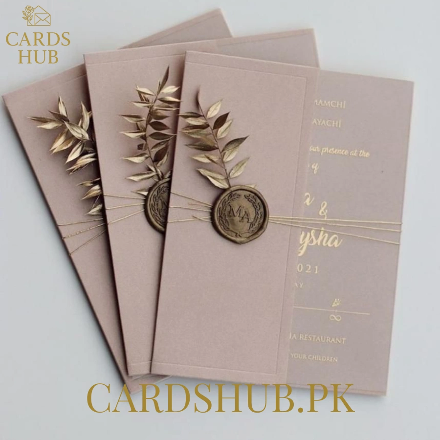 The design feels classy and minimal, making it ideal for weddings, nikkah, engagements, and reception events. Many shoppers look for nude wedding cards, minimal wedding invitations, wax seal invites, and gold foil wedding cards, which makes this design perfect for them