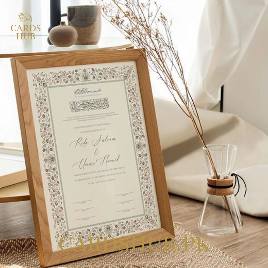 This soft floral nikah frame is designed for couples who prefer a natural and peaceful look in their home. The gentle floral border, light tones, and wooden frame finish create a warm and balanced style that feels calm, personal, and timeless.